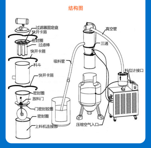 廣泛適用于食品、化工、制藥、塑料、無紡布、化纖、石墨等各行各業的原料輸送。完美地與包裝機、注塑機、粉碎機、混合機等設備的料斗相匹配。
